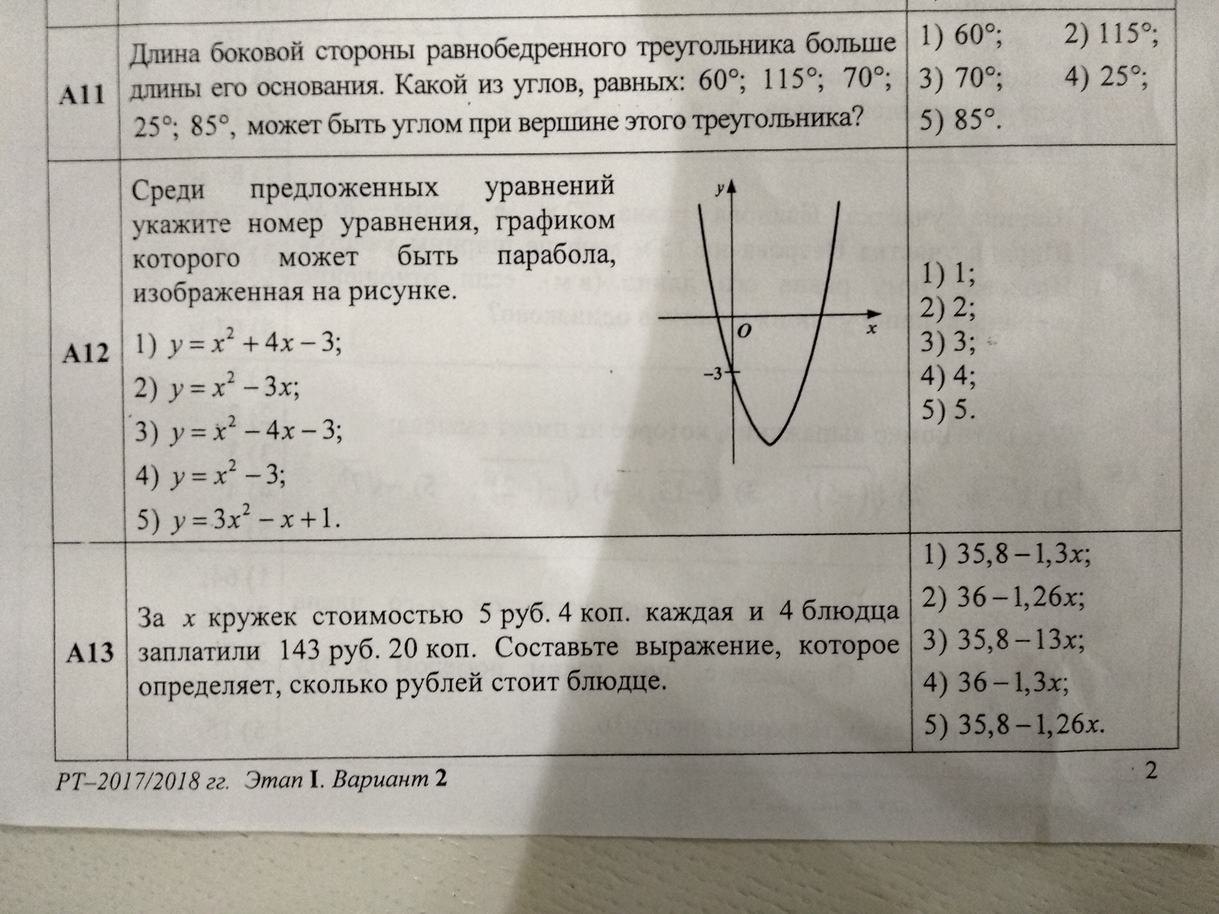 А12) ответ 3. Т.к. вершина параболы положительная координата. Находится она по формуле: