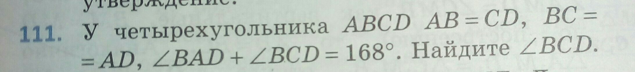 Так как АД=БС, АБ=ДС, то АБСД параллелограмм. Из этого следует, что противоположные углы у параллелограмма равны. Значит БАД=БСД= 168:2=84. Угол БСД = 84