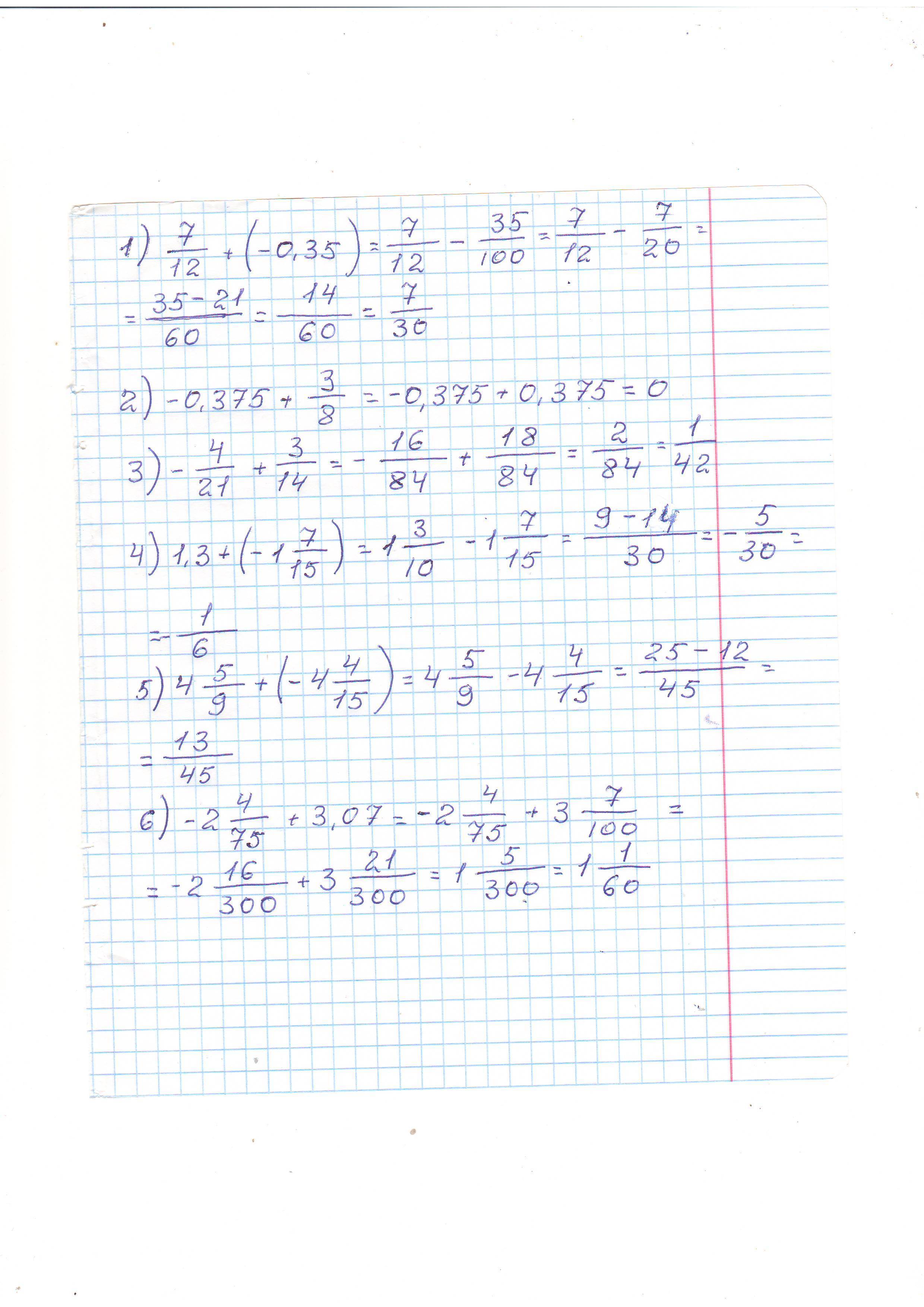 Найдите значение выражения: 1) 7/12+( - 0,35); 2) -0,375+3/8; 3) - 4/21+3/14; 4) 1,3+(-1 7/15); 5) 4 5/9 + (-4 4/15); 6) -2 4/75 + 3,0,7.