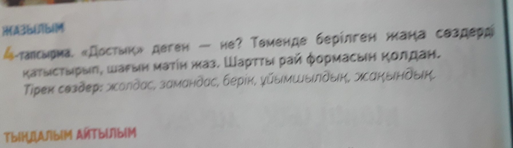 Достык ол сенiн ен жакын досын. Достык ен алдымен адамдардын бiр-бipiне деген сенiмiнен басталадыбаста лады. Халыкта <Алтын берген дос емес, акыл берген - дос>. деген макал бар. Достык бага жетпес кундылык. Жаксы досты оте киын тауып алуга. Дос ол сен уятка калдырмайды, ж/е ол сенi сатып кетпейдi. ДостарДостал олар бiр-бipiне комек тесу керек. Дос ол киын жерлерде комек теседi. Ен жаксы досты ешкiм ауыстыра алмайды. Дос ол ен манызды.