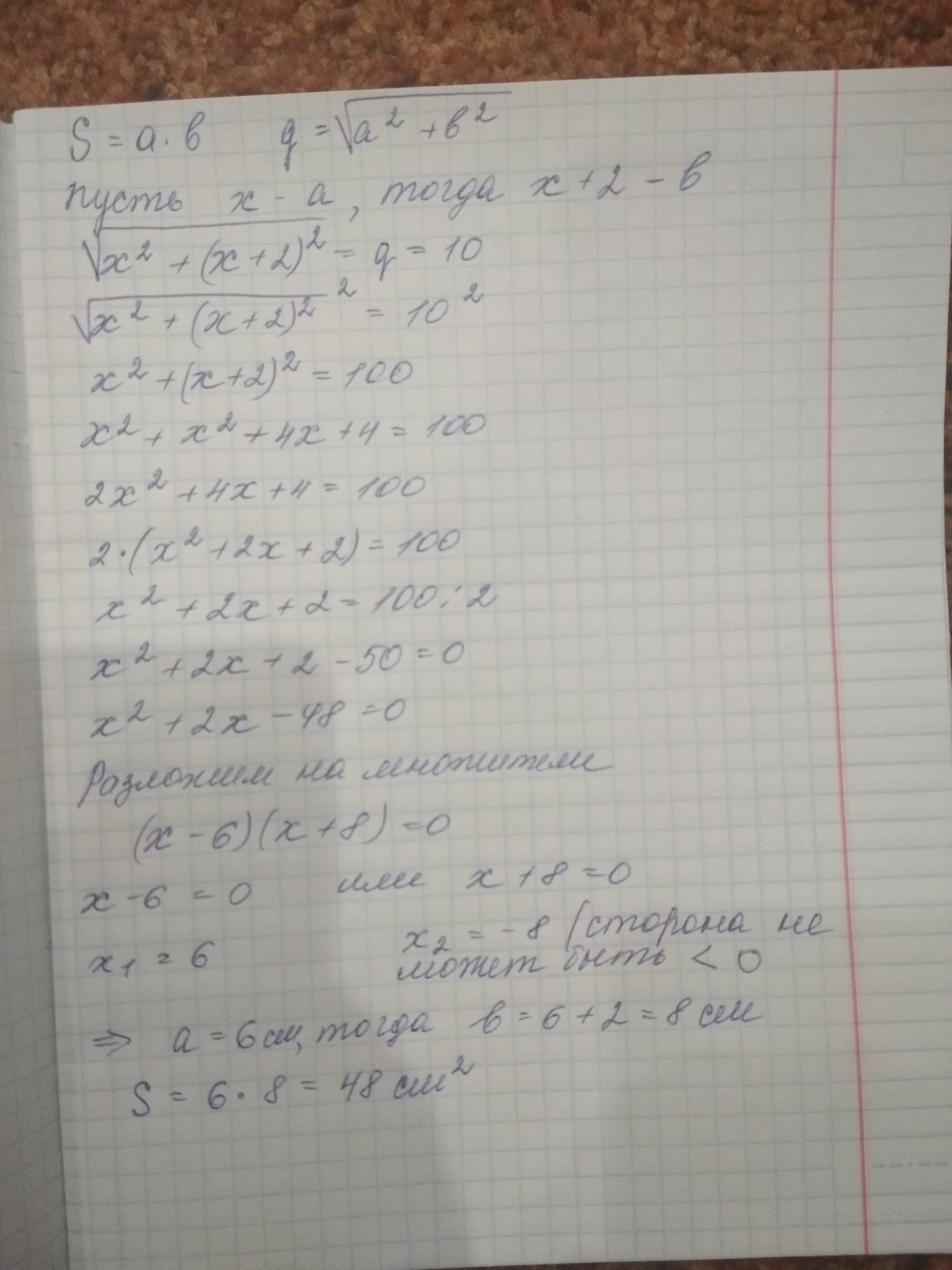 Чему равна площадь прямоугольника,диагональ которого равна 10сми одна сторона больше другой на 2см