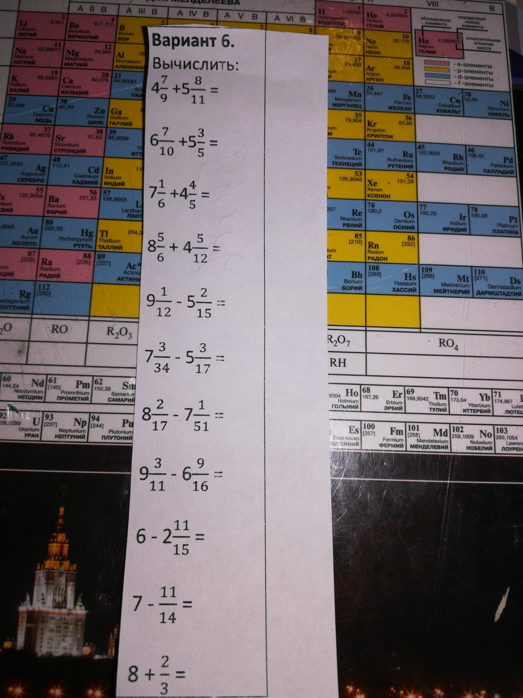 Короче смотри,чтобы решить надо перевести в неправильную дробь. То есть 8 целых умножаем на 6 и прибавляем 5. 2-ую дробь также. Складываем. Числитель и знаменитель. Числитель (сверху) знаменатель (снизу). Короче,лучше не списывай а посмотри уроки. На ютубе. Как складывать дроби(смешанные). А если сейчас эту тему упустишь,потом просто ступор будет. Говорю тебе как та у которой были проблемы с математикой.