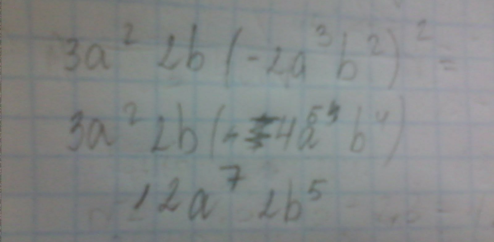 3а^2б(-2а^3б^2)^2=3а^2б(2а^3*б^2)^2=3а^2б*4а^6б^4=12а^8б^5
