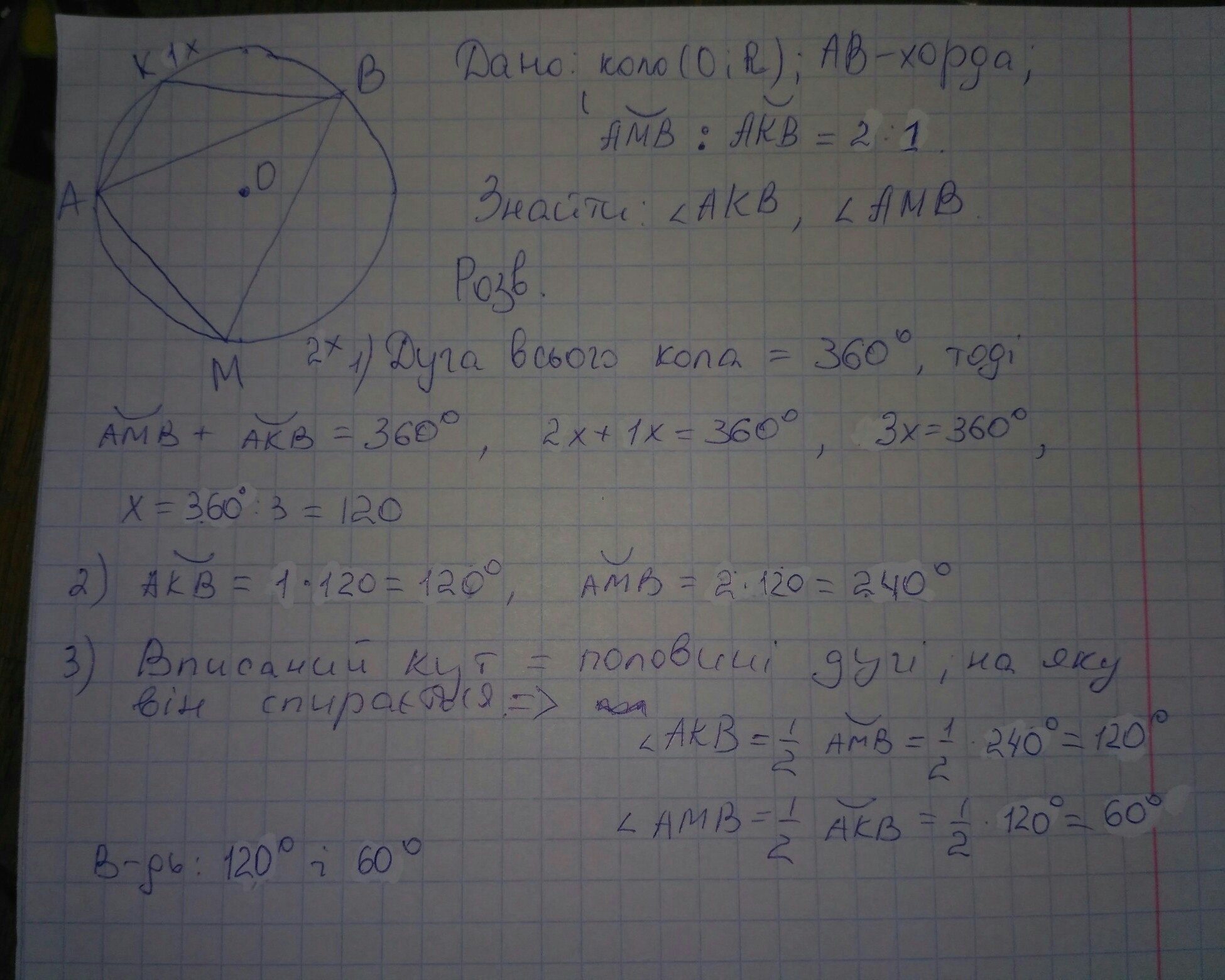 Хорда разбивает окружность на две дуги в отношении 1:2.Найдите градусные меры вписанных углов ,опирающихся на эти углы.