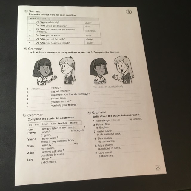 6. 2. listens to songs, 3. writes new words, 4. does, 5. asks and answers, 6. uses