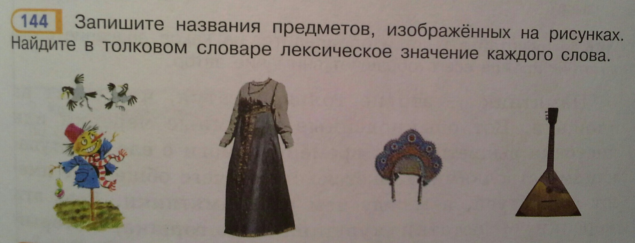 1пугало-чучело, выставляемое для отпугивания птиц 2 Платье - женская одежда, верхняя часть которой соответствует кофте, а нижняя юбке Кокошник - Старинный русский головной убор замужних женщин в виде разукрашенного и расшитого полукруглого высокого щитка надо лбом. Балалайка - русский народный инструмент
