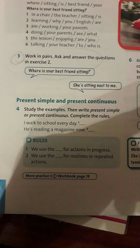 1 is the teacher sitting in a chair ? / yas, the teacher is sitting in chair 2 why are you learning English ? / becouse it is very intresting language 3 are you parents working? 4 what are you parents doing ? 5 Are you enjoying the lesson? 6 who is tolking to your teacher ?