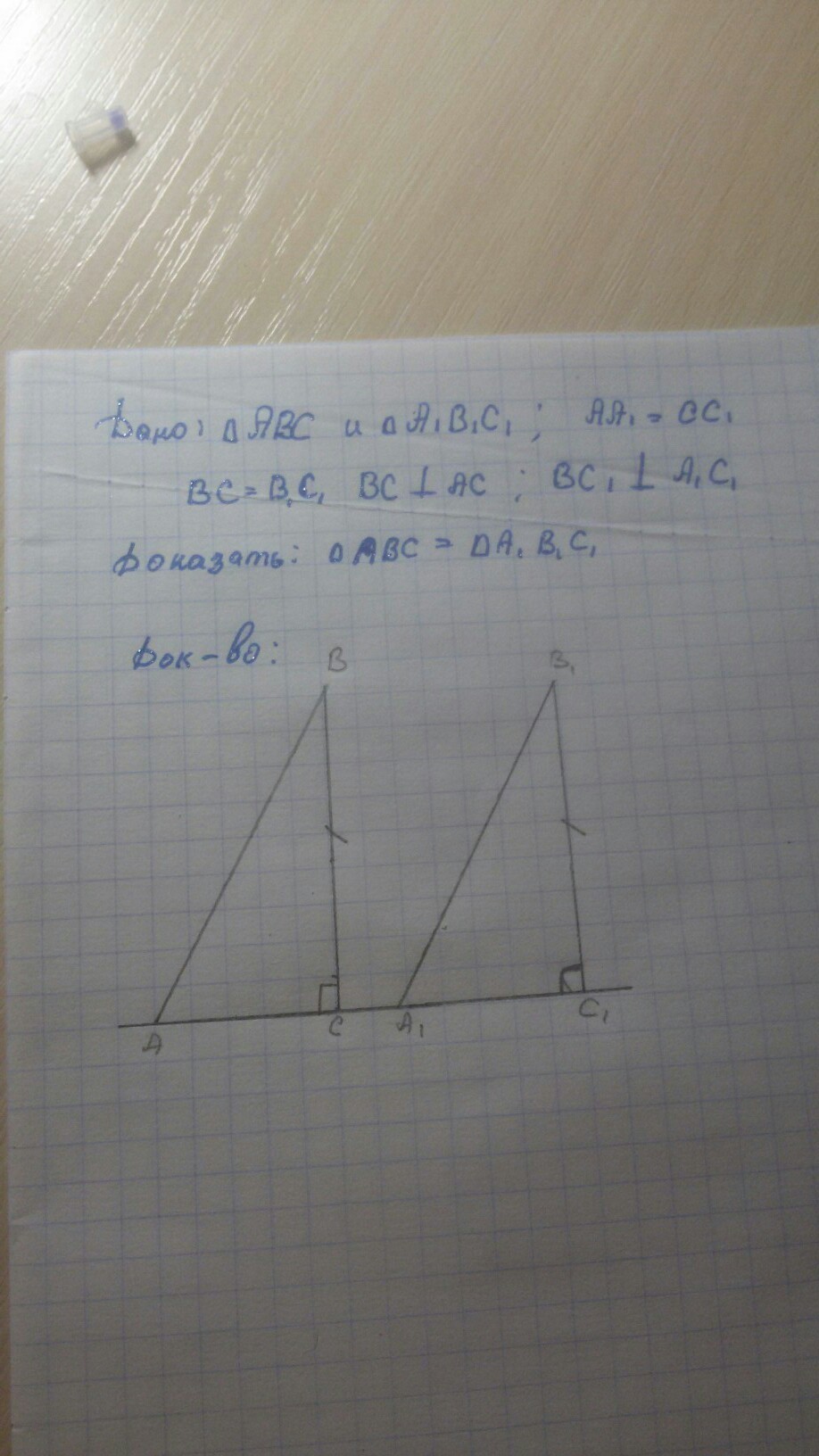 Треугольник АВС равен треугольнику А1В1С1 (по двум сторонам и углу)