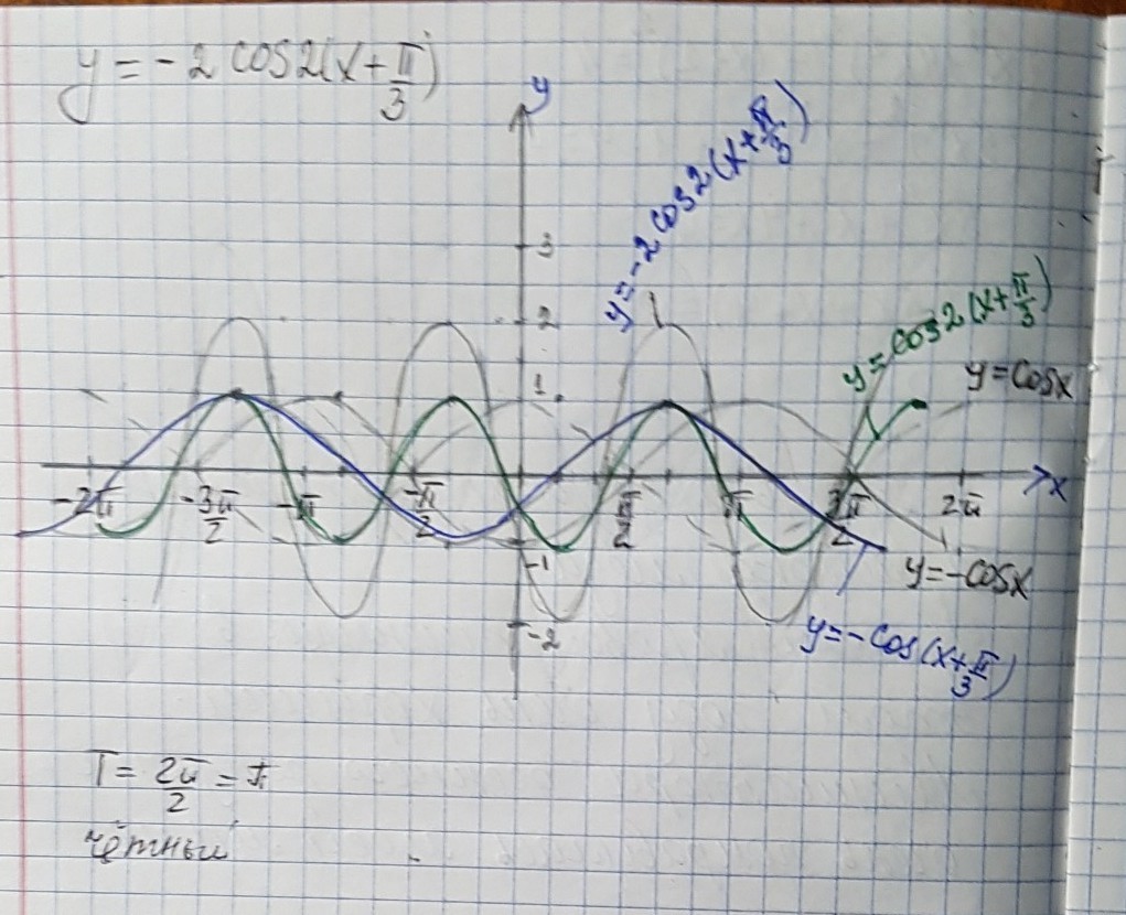 я сначала их сместил на пи/3 по оси Ох.Потом в одну волну у меня вошло две,это я сузил в 2 раза.Основная вершина у косинус а не смещается,иначе не получится.Потом график вытянул по оси Оу в 2 раза.