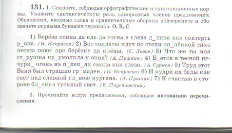 Берёза, осина да ель, да сосна, а слева долина, (С) как скатерть, ровна. (Н. Некрасов) Вот солдаты идут по степи опалённой, тихо песню поют про берёзку да клёны. (С. Львов) Что же ты, (О) моя старушка, приумолкла у окна? (А. Пушкин) Бьётся в тесной печурке огонь, на поленьях смола, (С) как слеза. (А. Сурков) Труд этот, (О) Ваня, был страшно громаден. (Н. Некрасов) И кудри их белы, (С) как утренний снег над славной главою кургана. (А. Пушкин) (В) К счастью, в стороне блеснул тусклый свет. (К. Паустовский)
