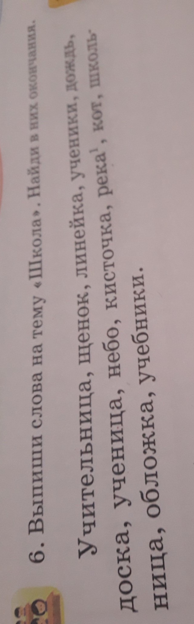 Учительница(окончание а), линейка(окончание а),ученики(окончание и), доска(окончание а),ученица(окончание а), кисточка(окончание а),школьница(окончание а),обложка(окончание а),учебники(окончание и)