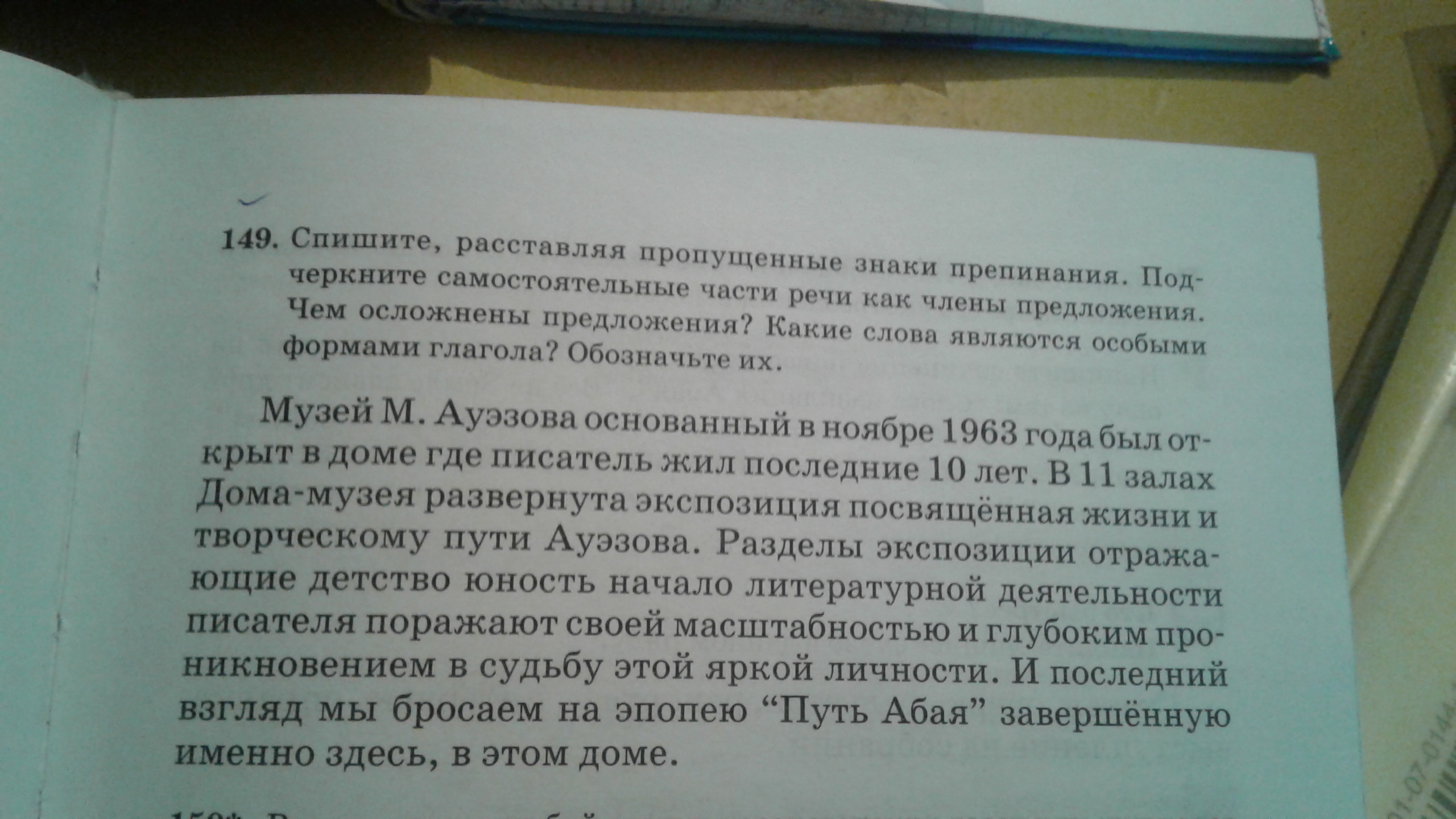 Упр 149. Спишите , расставляя пропущенные знаки препинания. Подчеркните самостоятельные части речи как члены предложения. Чем осложнены предложениия? Какие слова являются особыми формами глагола? Обозначьте их.