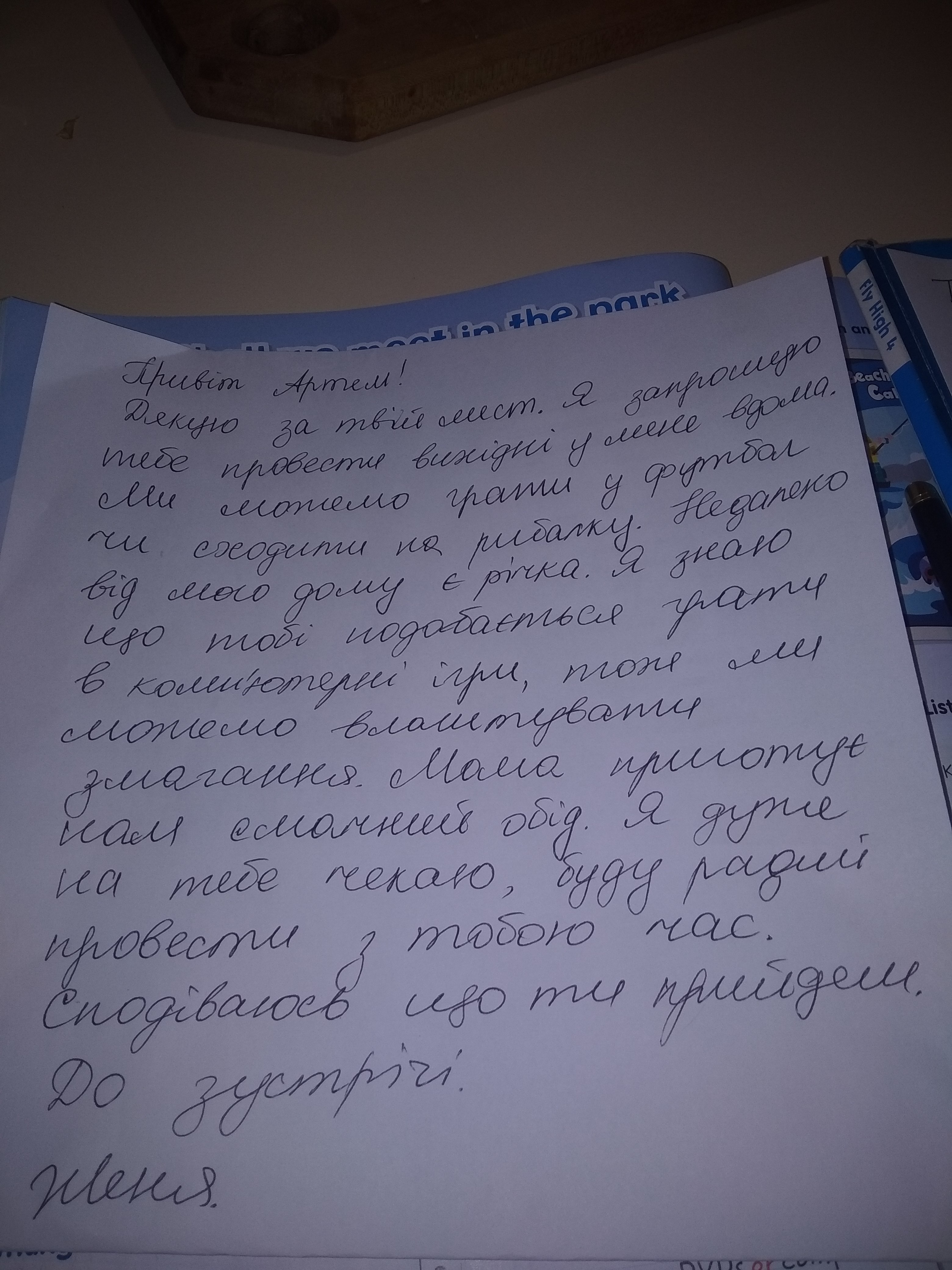 thanks for your email. do you want to spend a weekend with me?we can play football or do fishing.there is a river near my house. I know you like play games so we can do it.my mum will cook us a tasty lunch. I wait you very much and I would be happy to spend time with you. see you,Jenya