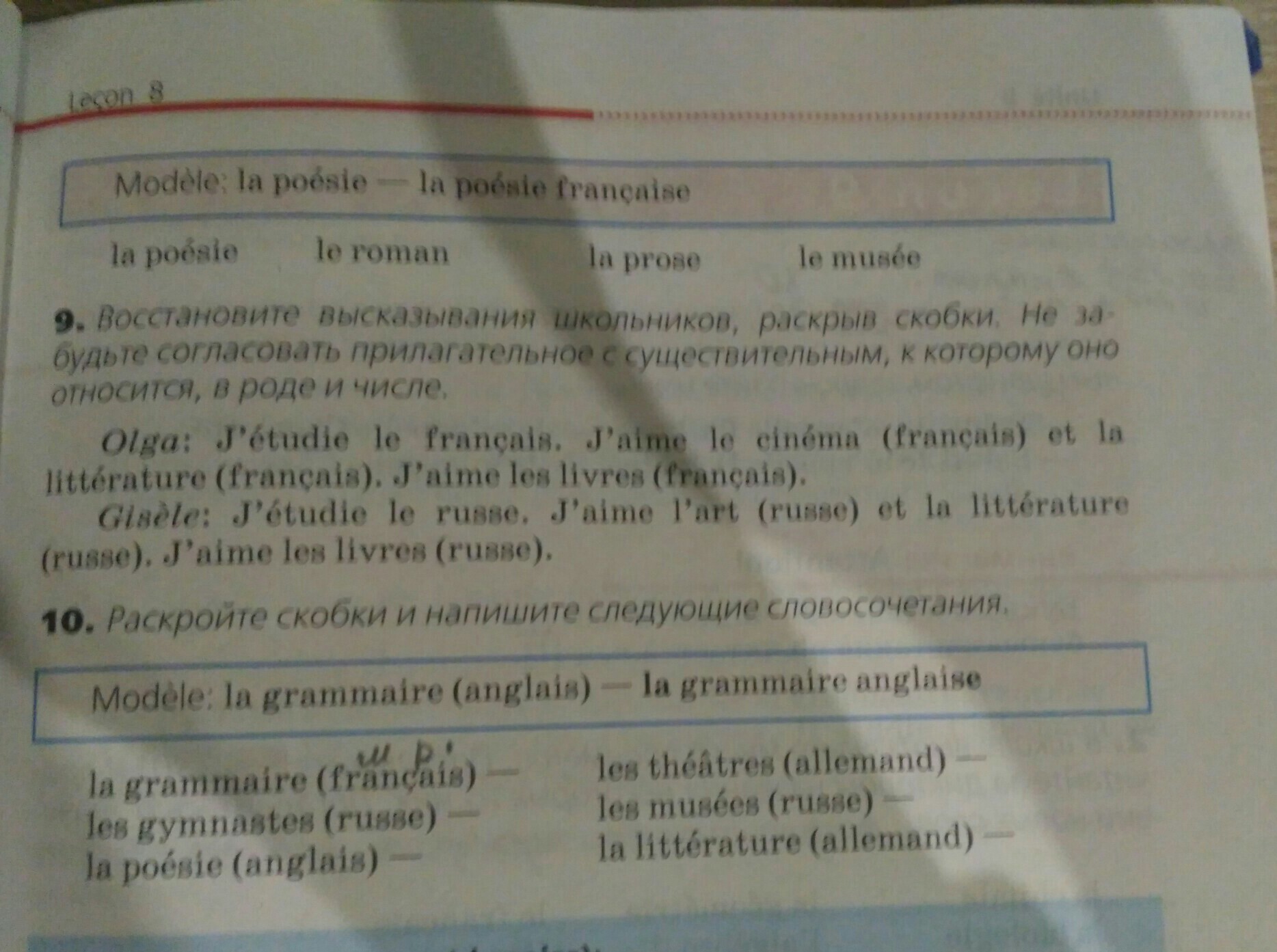 9. Olga : J’étudie le français. J’aime le cinéma français et la littérature française. J’aime les livres français.