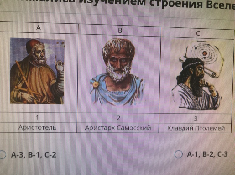 Соотнеси изображения и фамилии известных древнегреческих учёных, которые занимались изучением строения системы 1) А-3, В-1, С-2 2) А-1; В-2; С-3 3) А-2; В-3; С-1