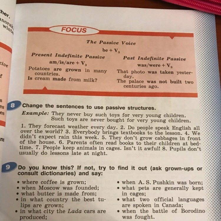 Измените предложения на использование пассивных структур Пример: они никогда не покупают такие игрушки для маленьких детей. Такие игрушки никогда не покупаются для очень маленьких детей. 1. Они прогнозируют погоду каждый день. 2. Говорят ли люди по-английски во всем мире? 3. Все приносят учебники на урок. 4. На этой неделе мы не ожидали дождя. 5. Они не выращивают капусту перед домом. 6. Родители часто читают книги своим детям в постели - обычно делают уроки поздно ночью.