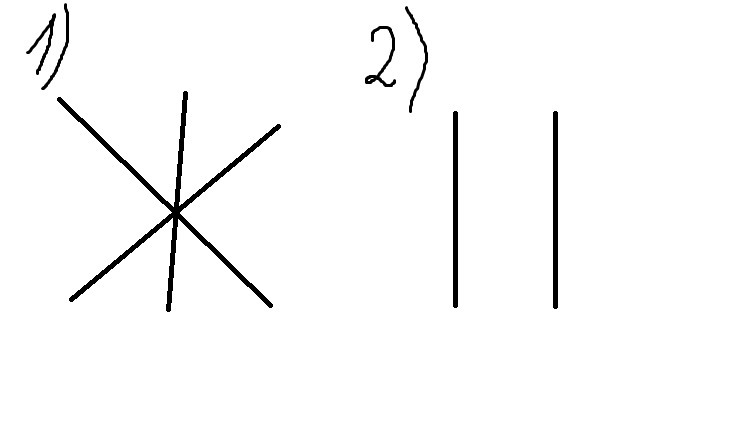 На странице тетради сначала изобразили 3! пересекающиеся прямые, а затем 2! параллельные прямые.