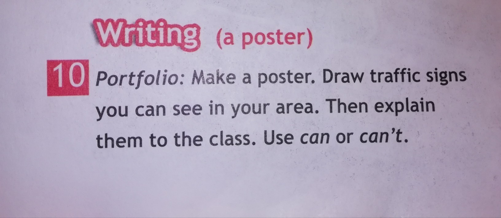 тебе нужно сделать постер . Нарисовать знаки дорожнoго движения в твоей местности. Нужно будет показать классу . Еще нужно использовать can и can’t.Я нарисовал как-нибудь , а ты сделай красиво . Фото прикрепил.