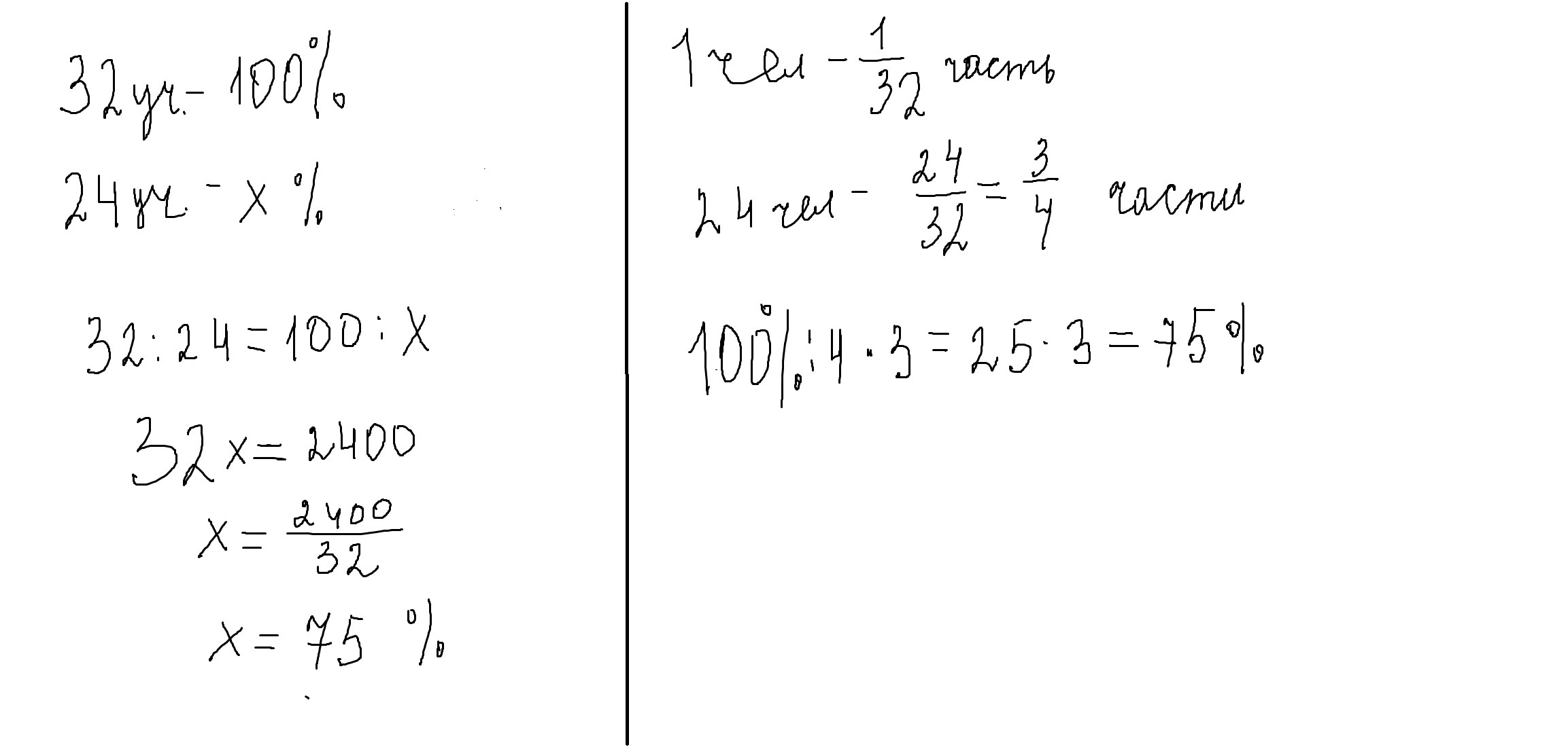 З 32 учнів класу 24 чоловіка займаються в спортивних секціях ? Яка частина учнів займається спортом?Відповідь вирази у процентах.