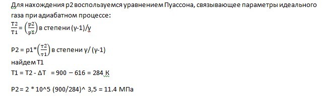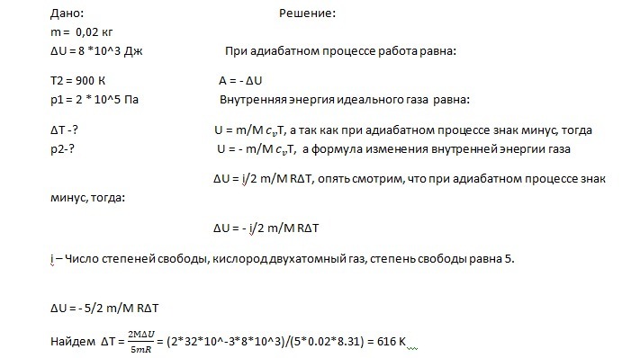 При адиабатном сжатии кислорода массой m=20 г его внутренняя энергия увеличилась на ΔU=8 кДж и температура повысилась до T2=900 К. Найти: 1) повышение температуры ΔT, 2) конечное давление газа р2, если начальное давление p1=200кПа.
