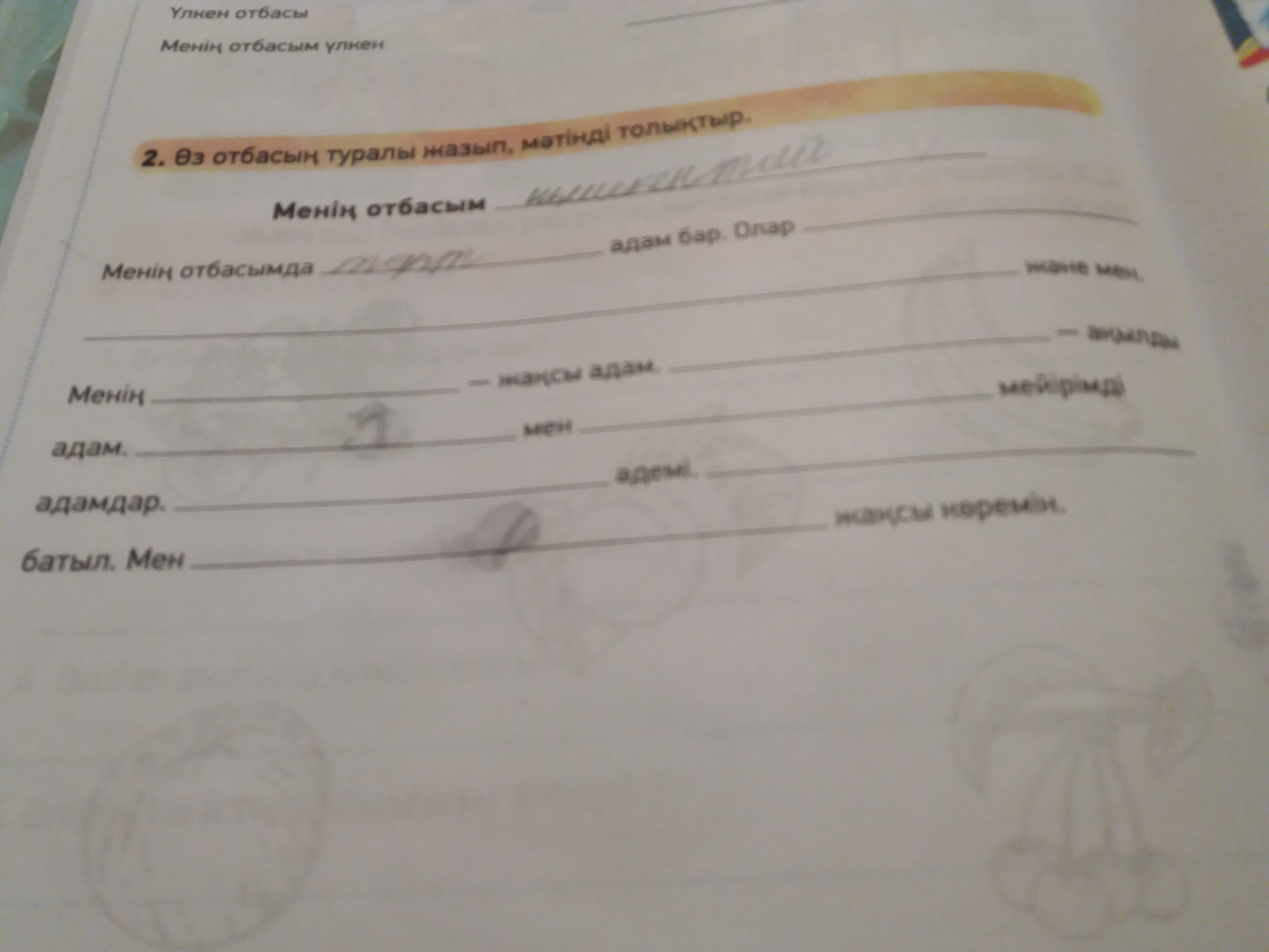 менин отбасм кишкентай ,менин отбасымда 4 адам бар олар акем анам апам мен менин анам жаксы адам оте акылды адам акем мен апам мейирмди адамдар апам адеми акем батыл мен оларды жаксы коремын