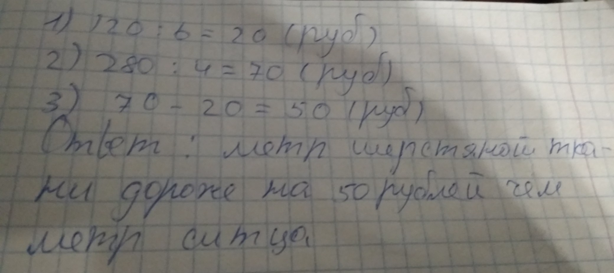 за 6 метров ситца заплатили 120 рублей,а за 4 метров шерстяной ткани - 280 руб , составь выражение которое обозначает на сколько рублей дороже метр шерстяной ткани чем метр ситца