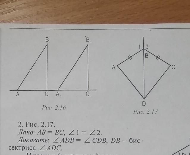 угол AB=ВC, угол АD=DC, угол ADB=CDB, DB - биссектриса угла АDC