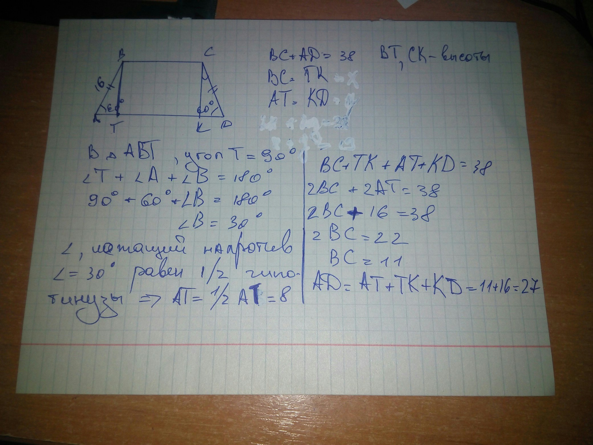 у рівнобічній трапеції гострий кут дорівнює 60 градусів а бічна сторона 16 см знайдіть основи трапеції,якщо їх сума дорівнює 38 см