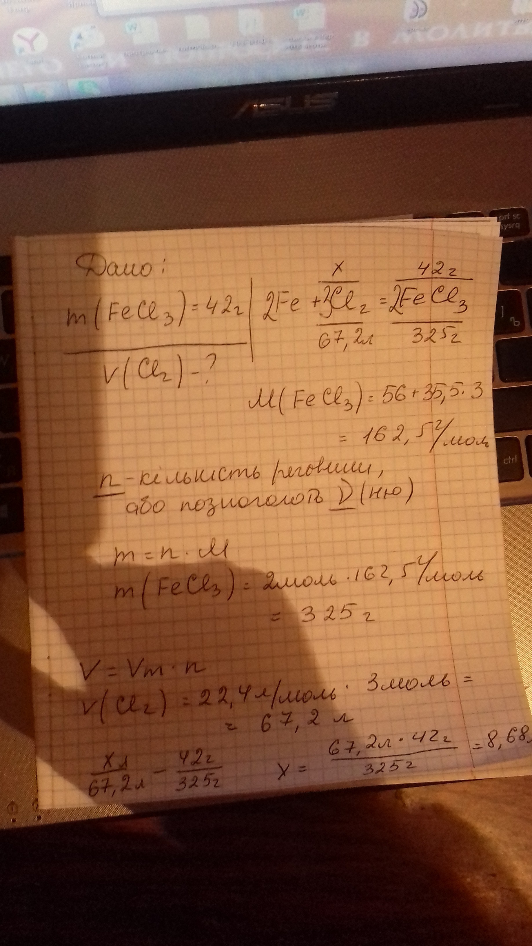 Знайдіть об'єм хлору , необхідний для добування феруму (3) хлориду масою 42грама .Помогите пожалуйста!!