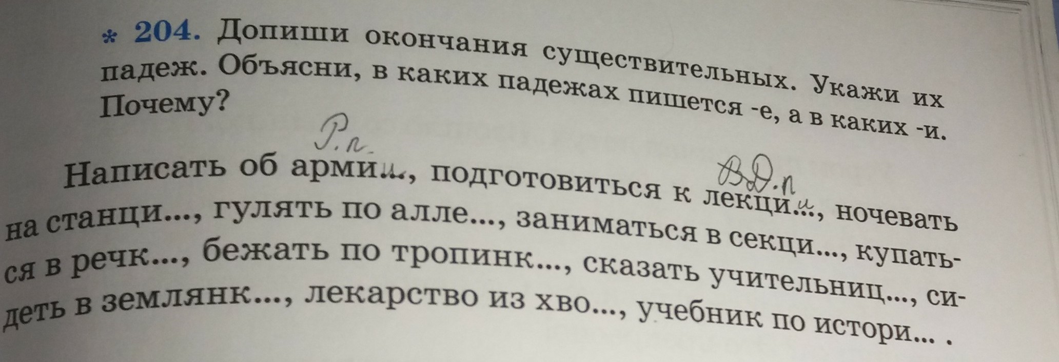 Об армии (П.п.),к лекции(Д.п.),на станции(П.п ) по аллее (д.п.) в секции( П.п.)в речке (П.п.),бежать по тропинке (Д.п.) учительнице (Д.п.),в землянике (П.п.)Лекарство из хвои ( Р.п.),по истории ( Д.п.)