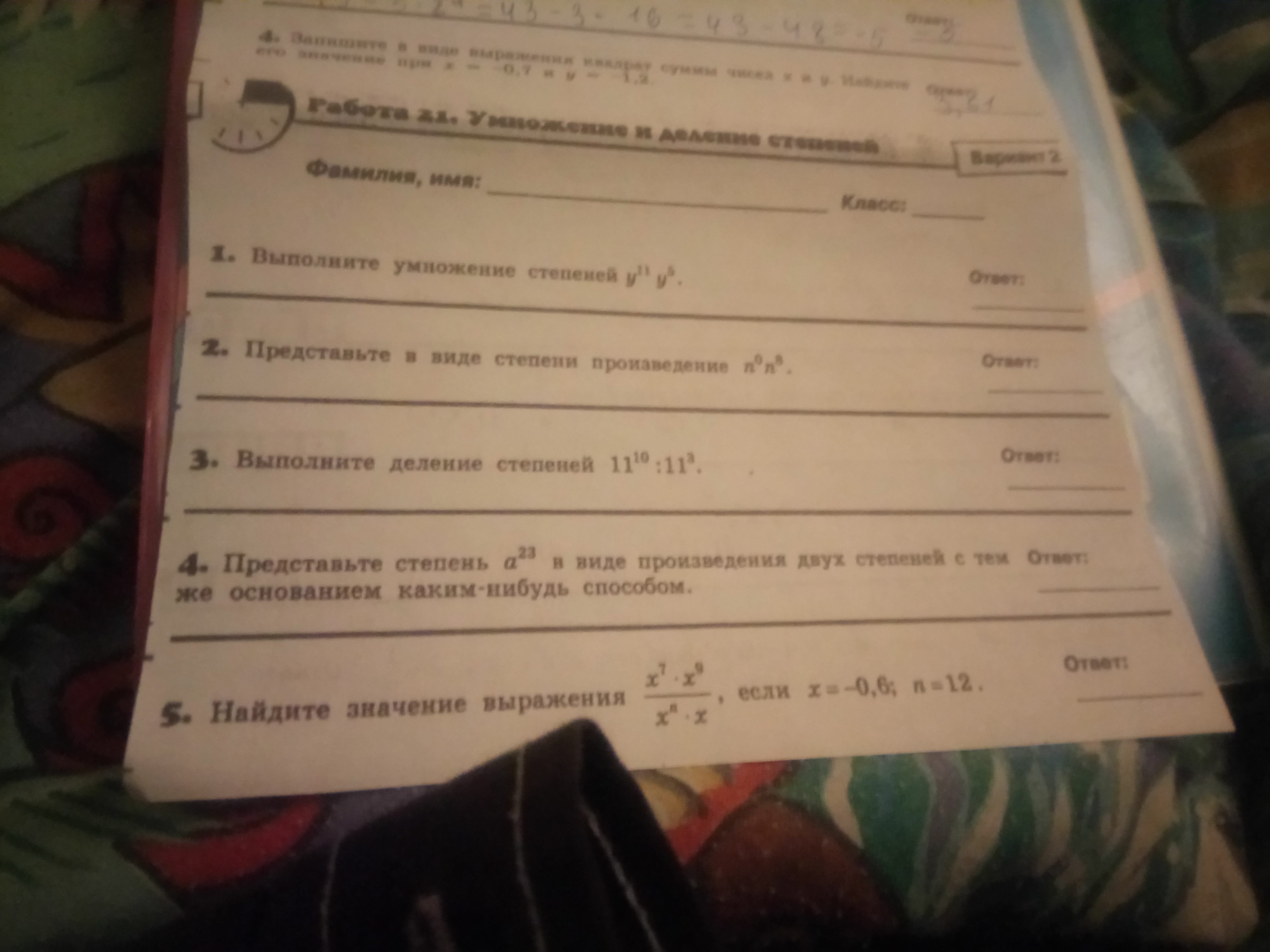 5. x⁷*x⁹/(xⁿ*x)=x⁽⁷⁺⁹⁾*x⁽ⁿ⁺¹⁾=x¹⁶/x⁽¹²⁺¹⁾=x¹⁶/x¹³=x⁽¹⁶⁻¹³⁾=x³=(-0,6)³=-0,216.