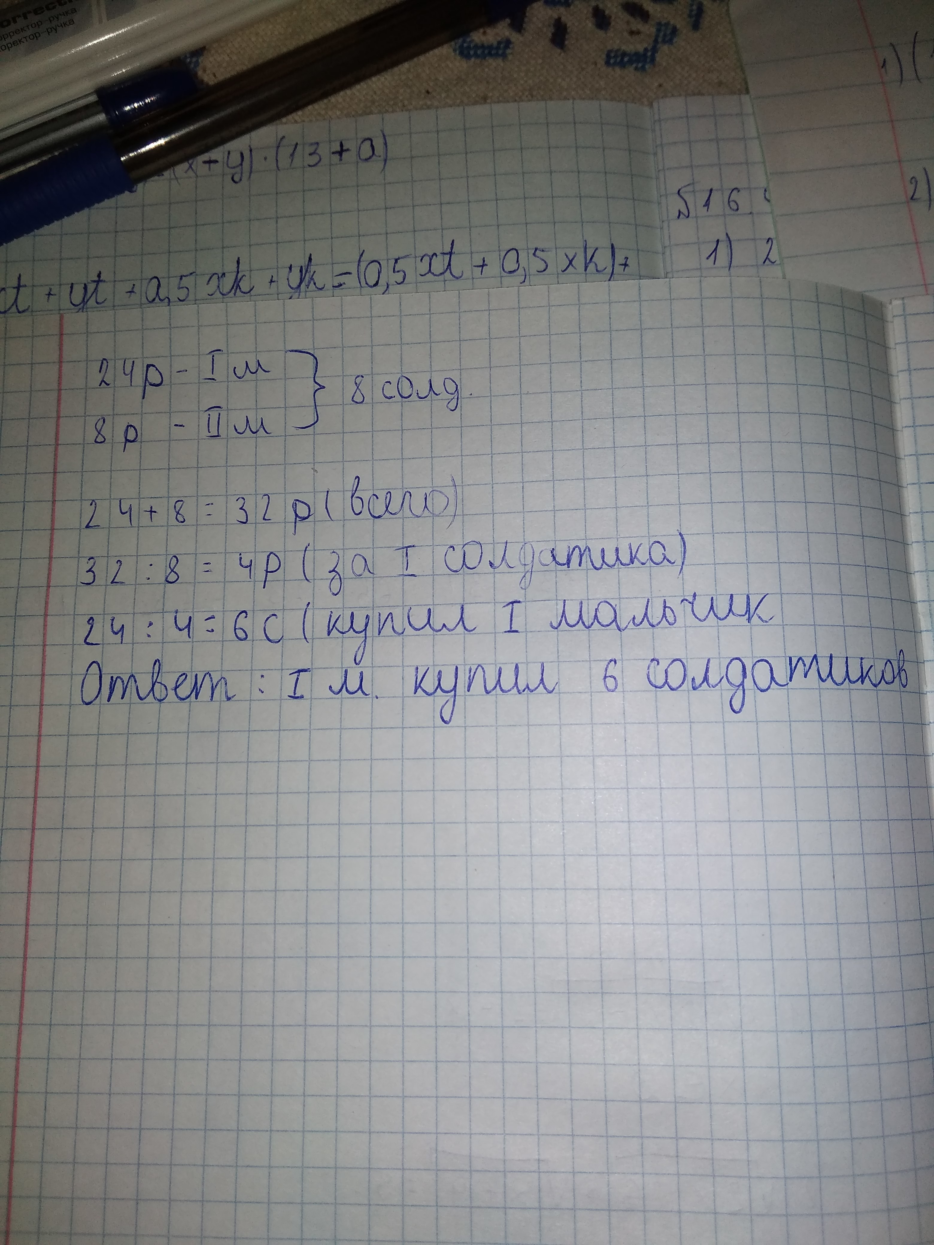 2 мальчика купили 8 солдатиков по одинаковой цене. Один заплатил за солдатиков 24 р., а другой 8 р. Сколько солдатиков купил первый мальчик?
