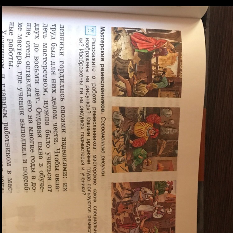 б)На третьем рисунке изображена обувная мануфактура,где производили туфли.На этой мануфактуре использовали слесарные инструменты того времени.Что бы облегчить свой труд мастера набирали себе помощников-подмастерьев.Те проходили обучение и помогали мастерам.