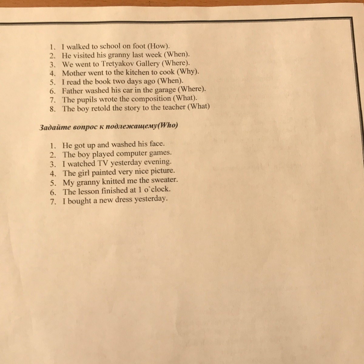 How did you walk to school? When did he visit his granny? Where did we go ? Why did mother go to the kitchen? When did you read the book? Where did father wash his car? What did the pupils write ? What did the boy retell to the teacher?
