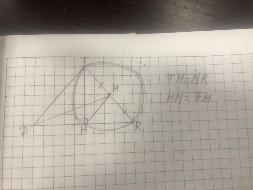 В треугольнике DRT проведены медиана DM и высота TH. Найдите длину RT, если MH=7 метров.(в метрах)