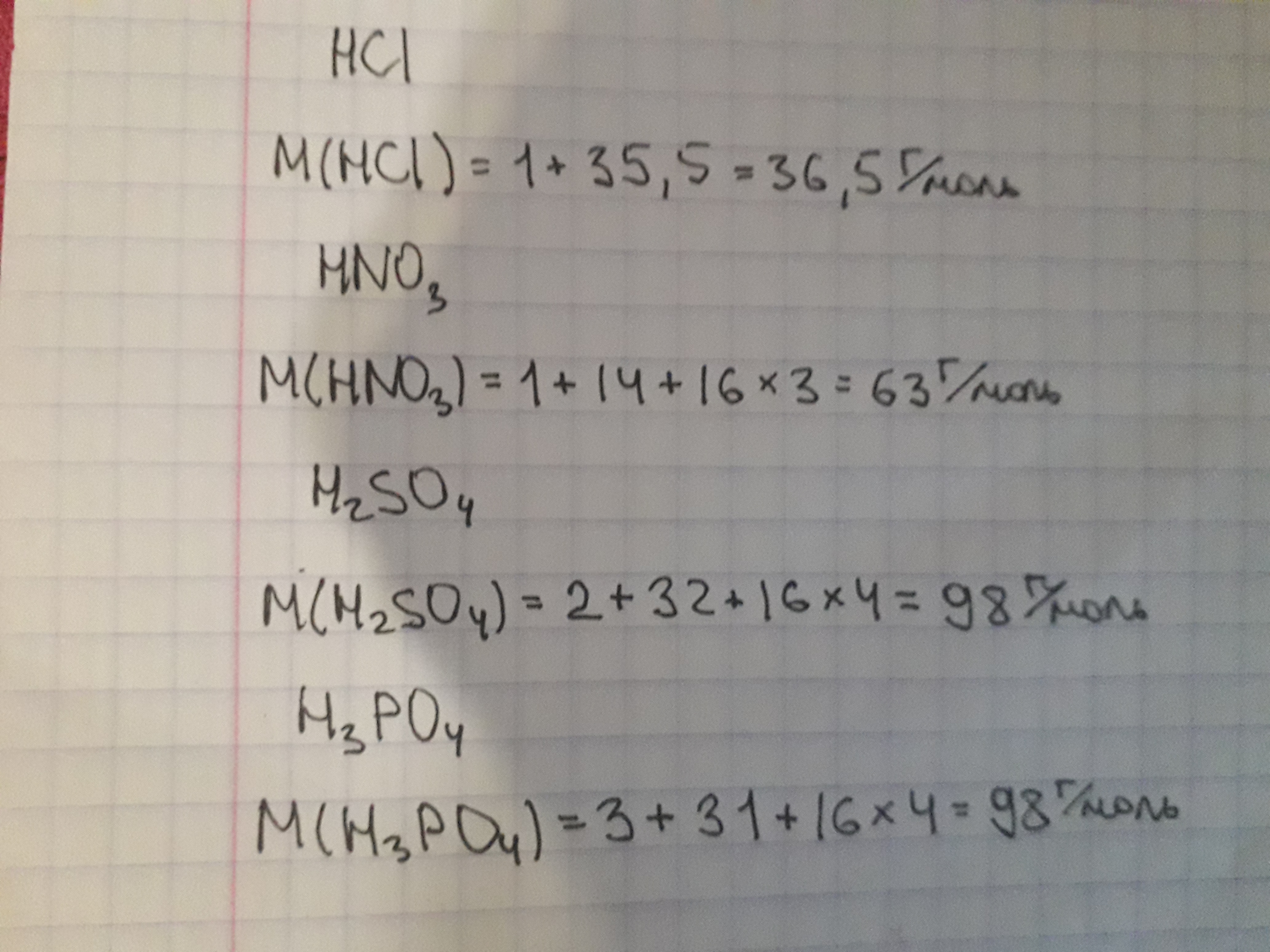 HCI Mr(HCI)=1+35,5=36,5 M(HCI)=36,5г./моль