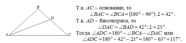 В ровнобедренном треугольнике abc с основанием ac проведена биссектриса ad. Найдите угол adc если b= 96°