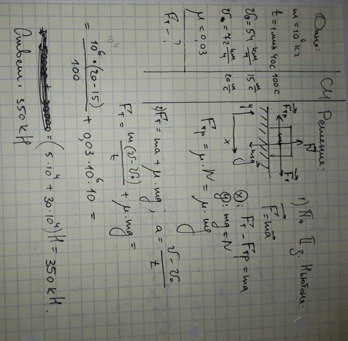 Поезд массой 10^6 кг за 1 минуту 40 секунд увеличил скорость 54 км/ч до 72 км/ч. Найти силу тяги, если коэффициент сопротивления движению равен 0,03