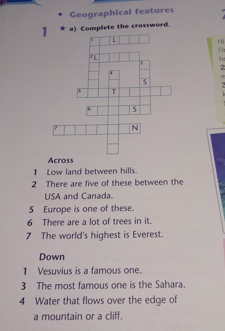 Across: 1. Valley 2.Lakes 5. Continent 6. Forest 7.Mountain