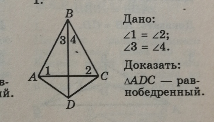 Рассматривая треугольники ABD и DBC, то AD и DC лежат против равных углов(угол 3 и 4), то AD=DC.(против равных углов лежат равные стороны.)