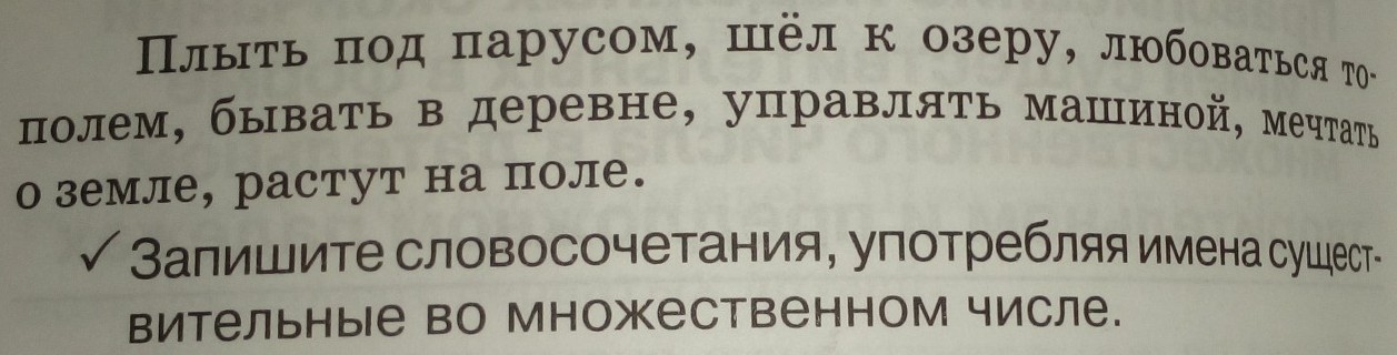 Плыть под парусами,шёл к озёрам,любоваться тополями,бывать в деревнях,управлять машинами,мечтать о землях,растут на полях.