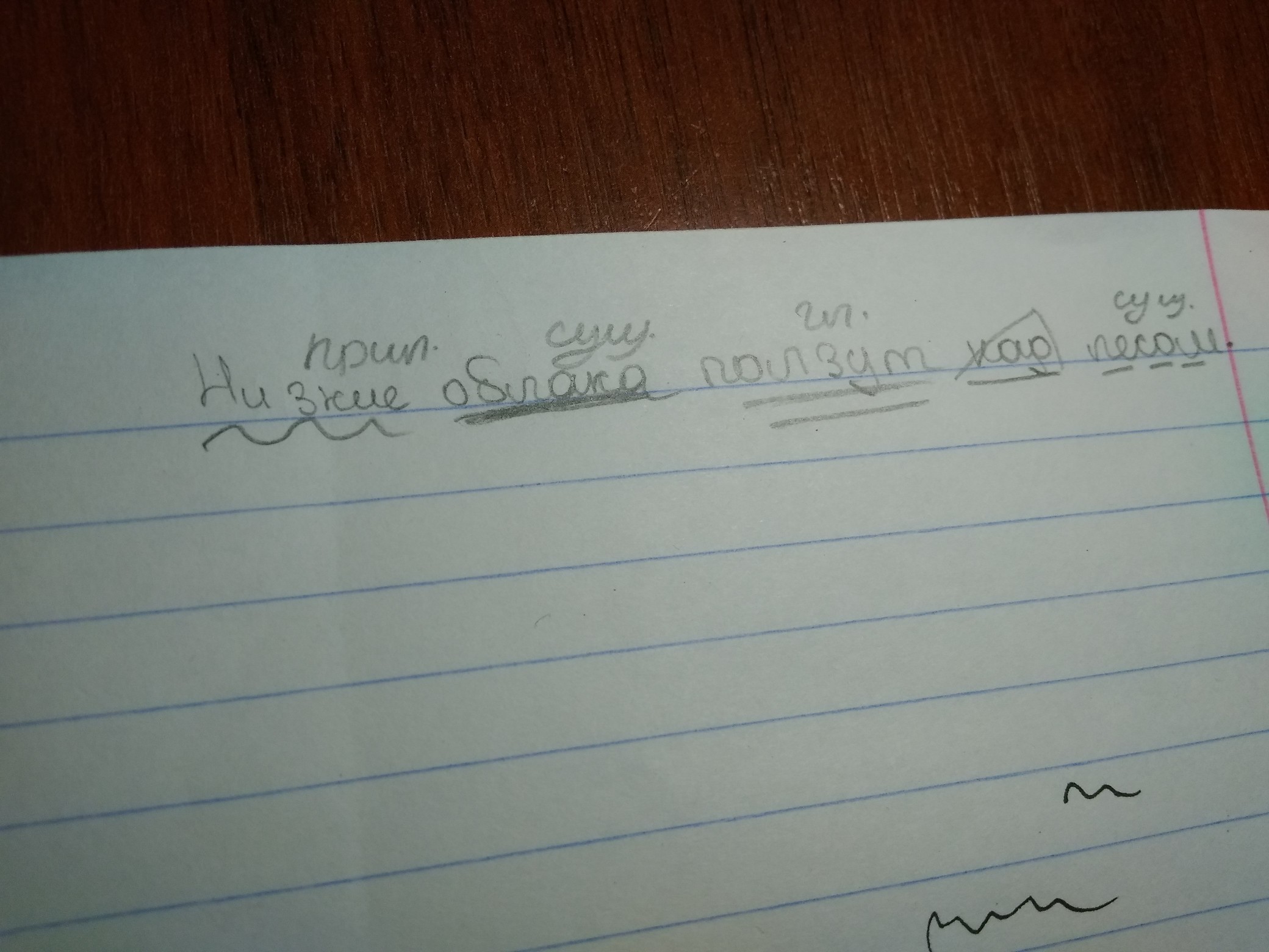 Помогите пожалуйста разобрать по членам предложения и по частям речи.Низкие облака ползут над лесом.