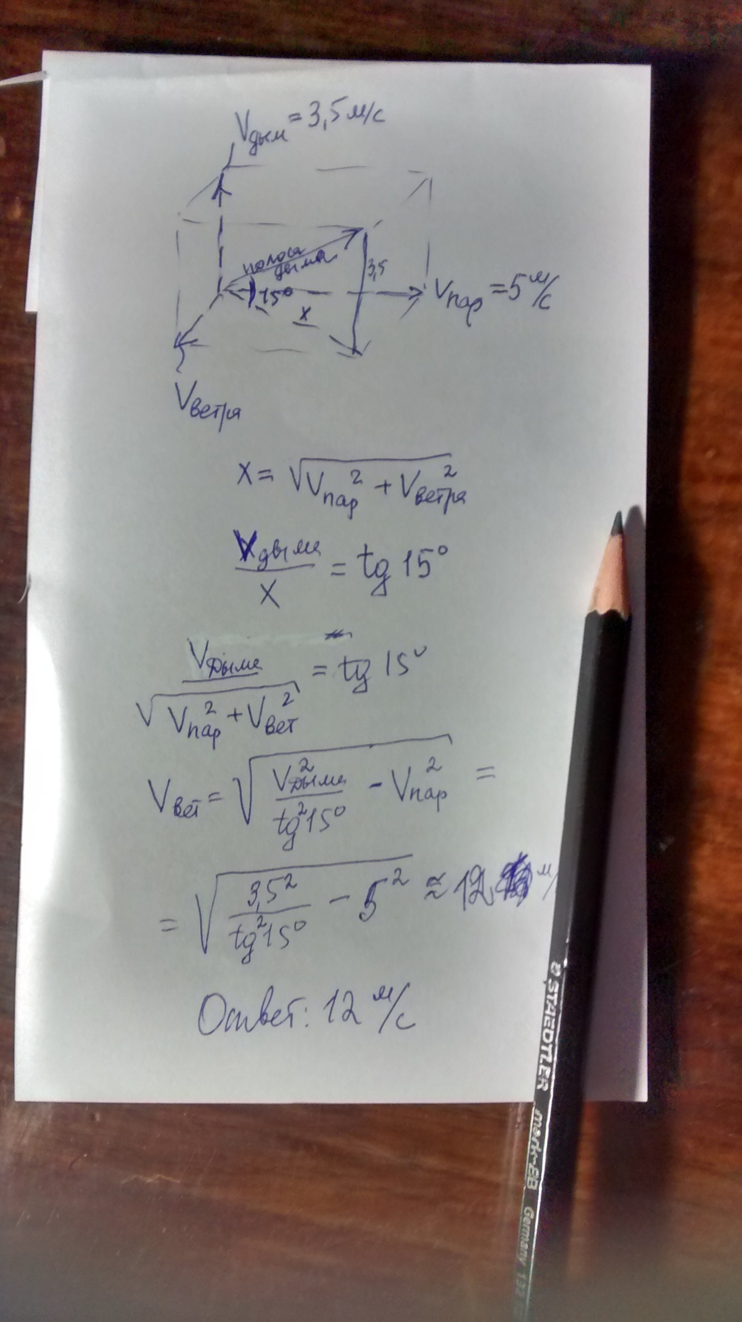 Пароплав плывёт на север со скоростью 5 м/c. Дым поднимается со скоростью 3.5 м/с. Определите скорость западного ветра, если полоса дыма образовала угол 15 градусов с поверхностью воды, tg15=0.27