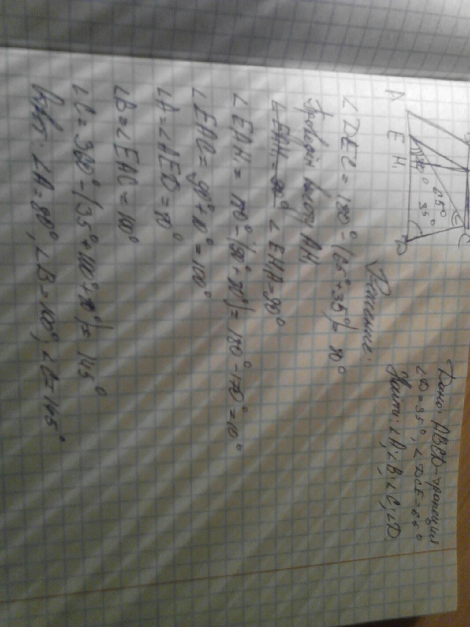 Помогите, геометрия 8 класс.Через вершину С трапеции ABCD проведена прямая, которая параллельна боковой стороне AB и пересекает большее основение AD в точке E. Найдите углы трапеции, если уголD=35 градусов,уголDCE=65градусов.