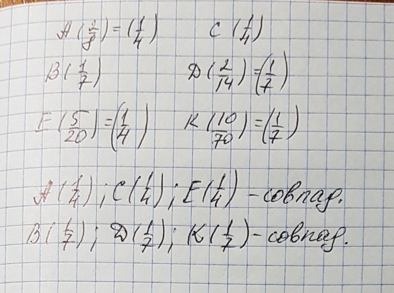 на координатном луче отмечены следующие точки A 2/8,B 1/7, C 1/4, D 2/14, E 5/20, K 10/70. найдите совпадающие точки ?