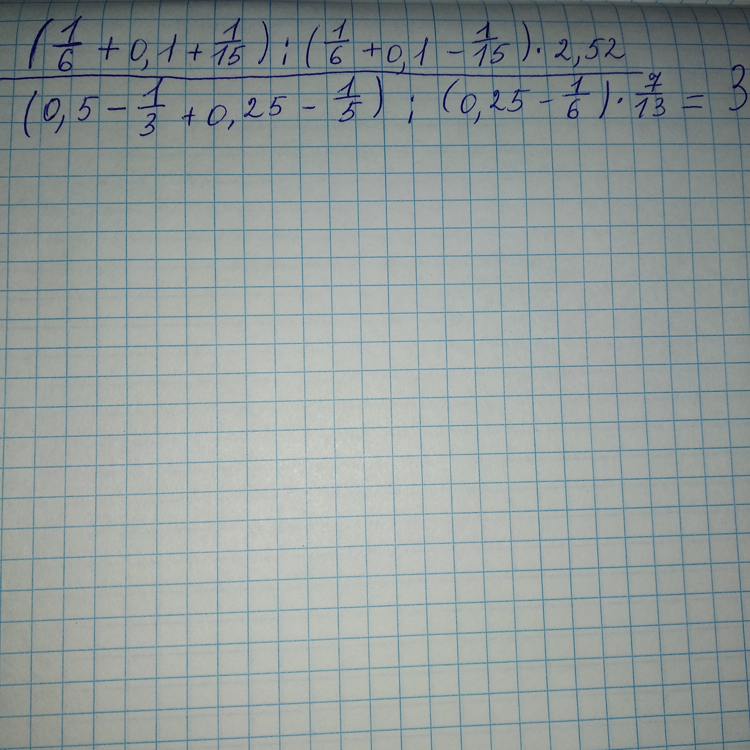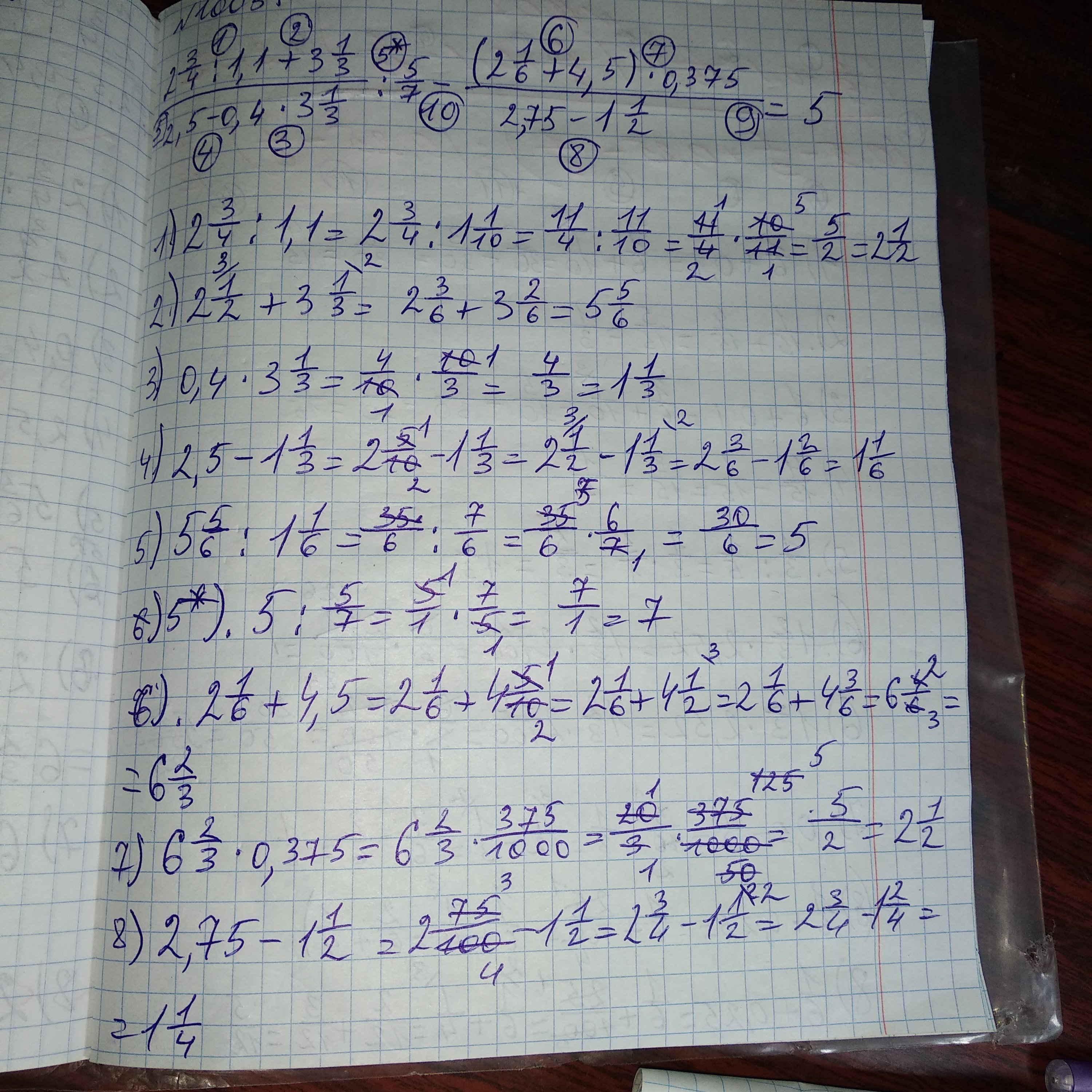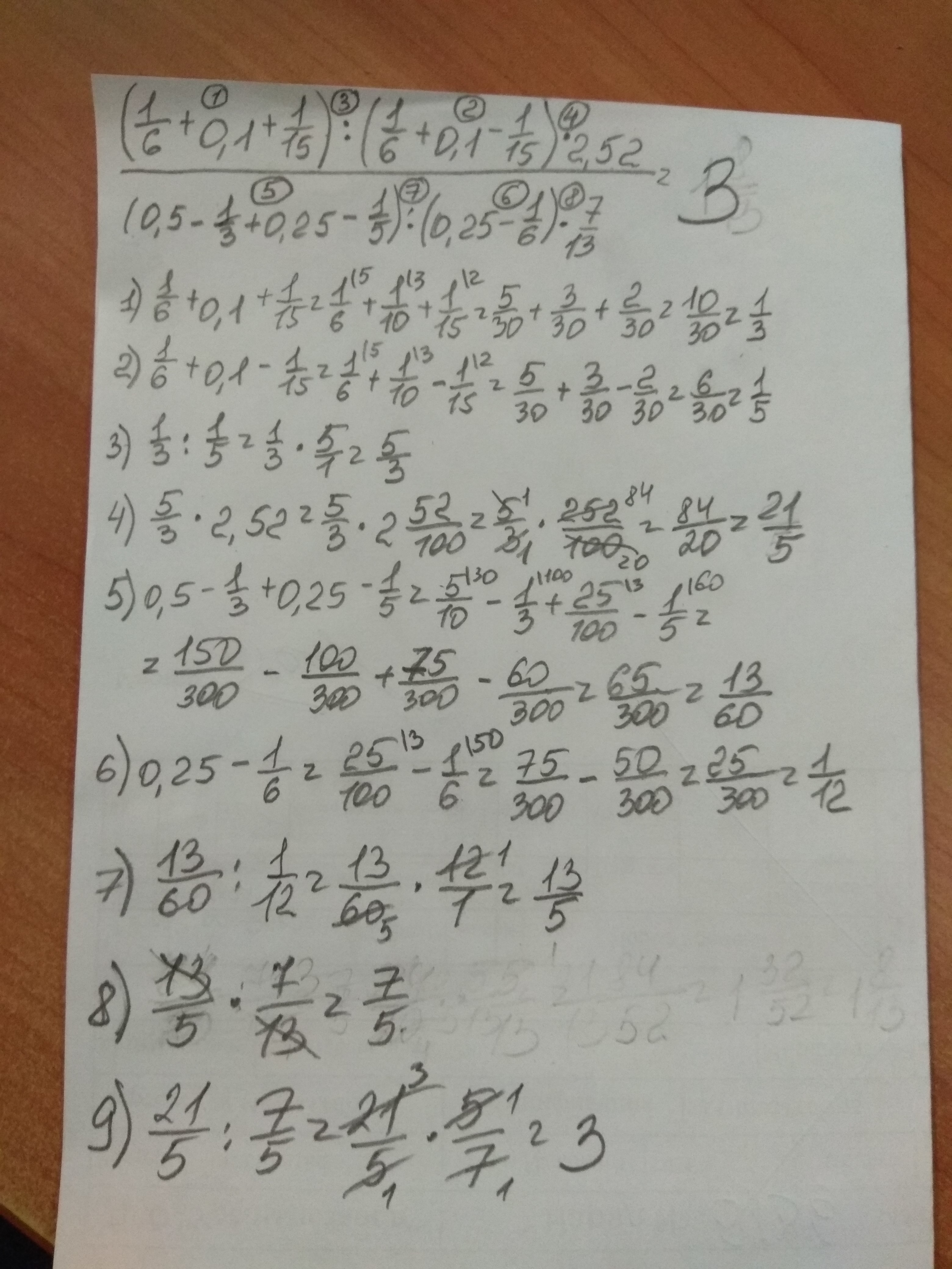 Помогите решить пожалуйста!! Ответ должен получиться - 3 (так написано в ответах книги) , я решаю и у меня получается 3 целых три пятых , там нужно сделать порядок действий и всего их там 13. Пример решения на 2 фото (это другой пример)
