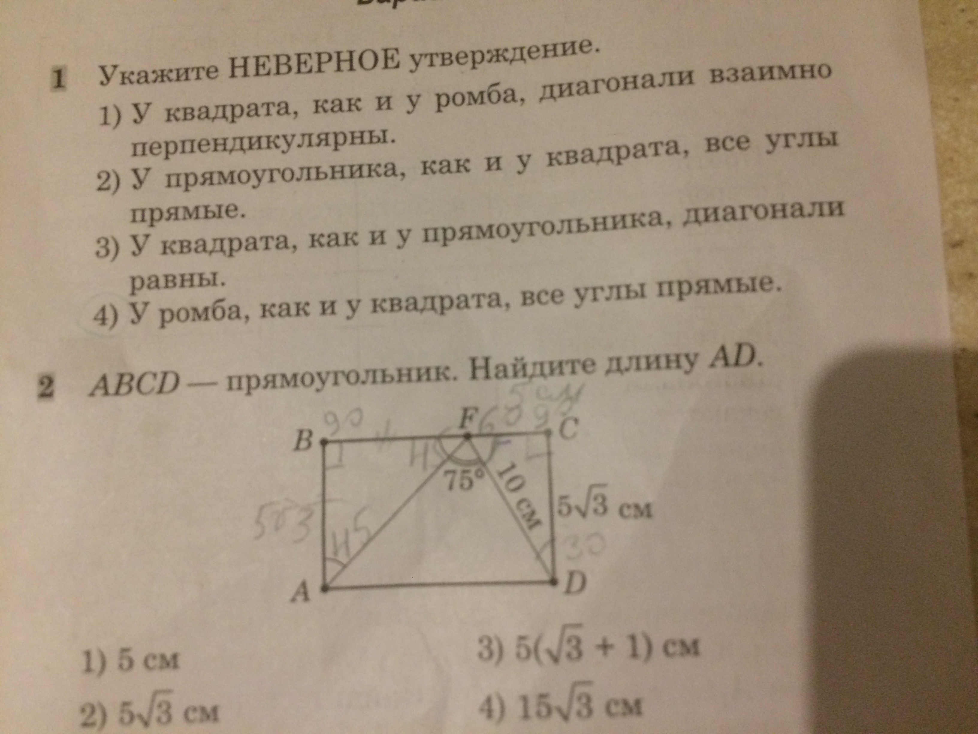 Тогда по Пифагору: FC=√(FD²-CD²) = √(100-75) = 5см. Значит <CDF=30°(так как катет, лежащий против этого угла, равен половине гипотенузы), а <CFD=60° (так как сумма острых углов прямоугольного треугольника в сумме равны 90°). => Угол AFC=75+60=135°, <BFA=45° => прямоугольный треугольник АВF - равнобедренный. BF=AB=CD=5√3. FC=5 см.