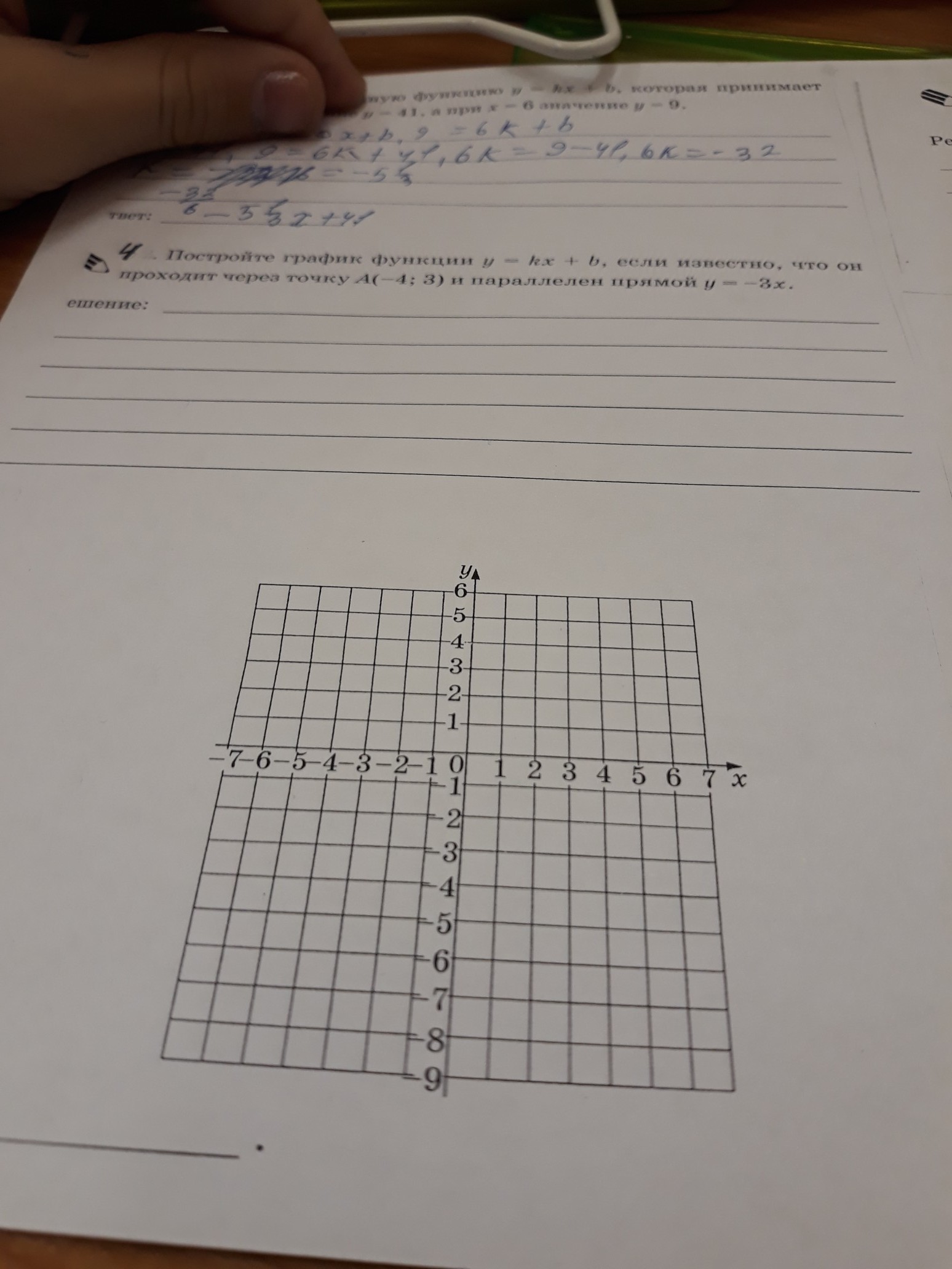 постройте y=kx+b, если известно, что он проходит через точку A (-4;3) и параллельной прямой y=-3x