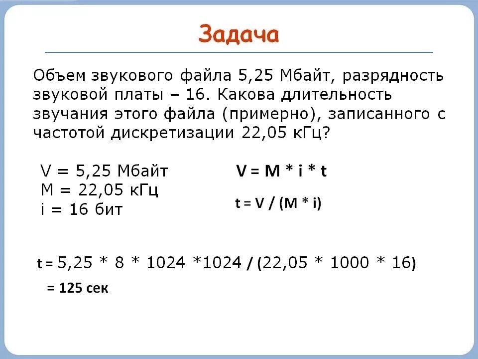 Объем свободной памяти на диске – 8,25 Мбайт, разрядность звуковой платы – 16. Какова длительность звучания цифрового аудиофайла, записанного с частотой дискретизации 28,25 кГц?