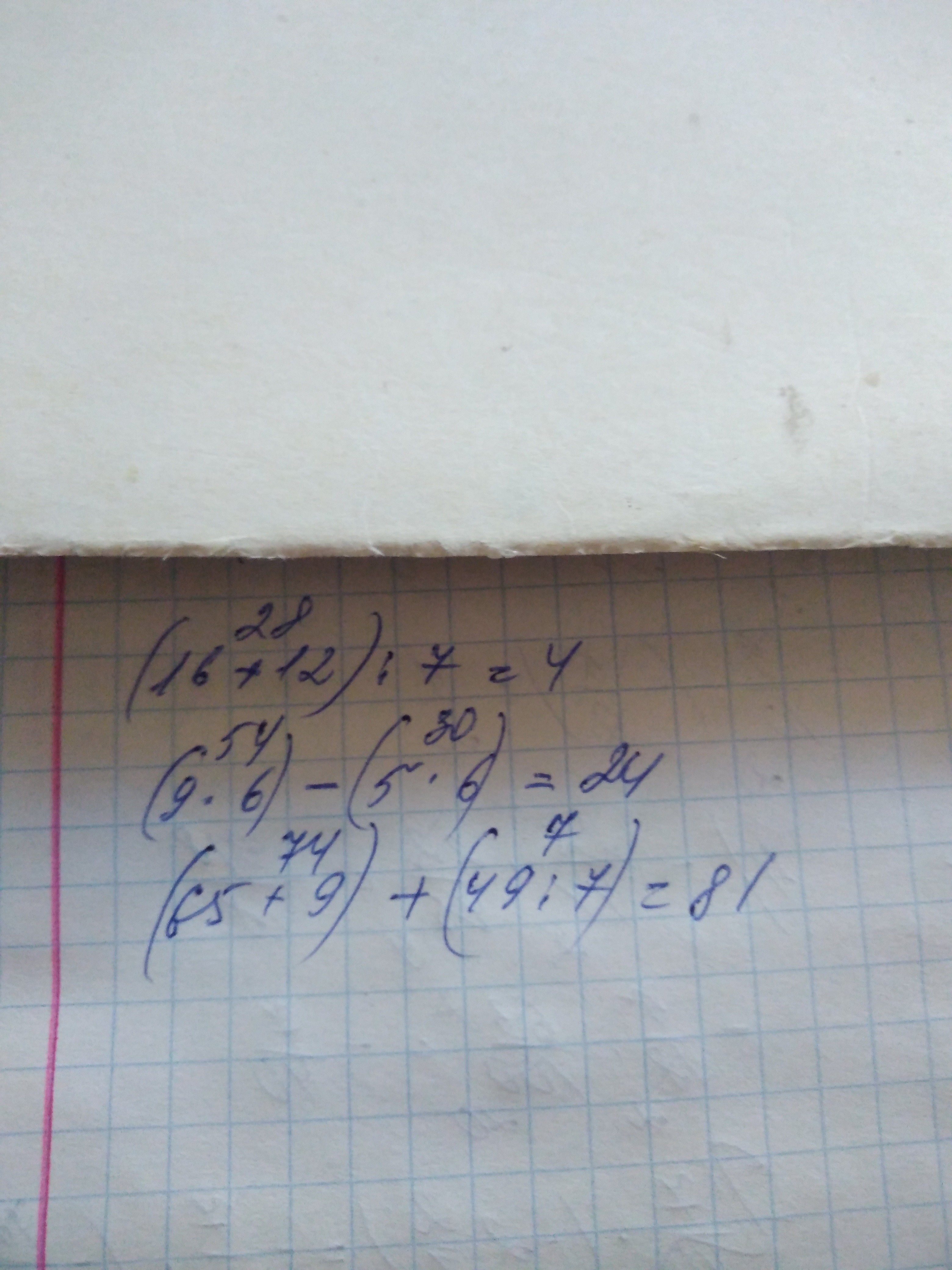 Какие выражения решал ученик если он записал решение по действиям 16+12=28,/ 28÷7=4/ 9*6=54/5*6=30/54_30=24/65+9=74/49÷7=7/74+7=81.